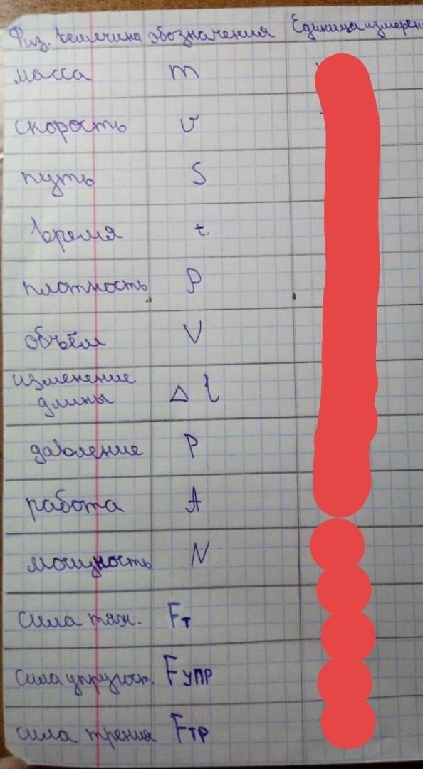 Здравствуйте помогите пожалуйста, в школе пока меня не было на физике записали тоблицу в тетрадь (сказали что должен обезательно записать), училка сказала что бы спрасил у одноклассников а они не дают, добился от них только чистичной(фото), помогите запишите или найдите пожалуйста полную версию (там кроме этих надо силу архимеда и вес) последний столбик это формулы