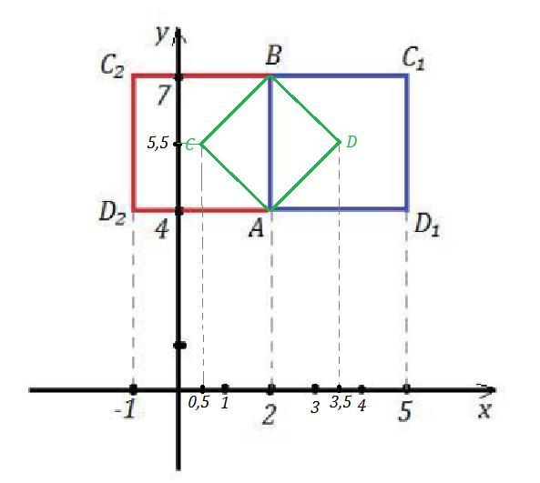 Ещё один квадрат можно построить, если точки А и В принять за концы диагонали квадрата. Тогда точки C и В имеют координаты: С(0,5 ; 5,5) и D(3,5 ; 5,5) .