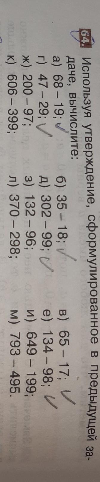 Ответ: 68-19=49; 47-29=18; 200-97=103; 606-399=207; 35-18= 17; 132-96=36; 370-298= 72