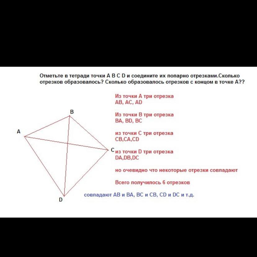 Отметьте в тетради точки A,B,C,D и соедините их по парно отрезками. Сколько отрезков получилось? Сколькл оброзовалось отрезков с концом точки А ?