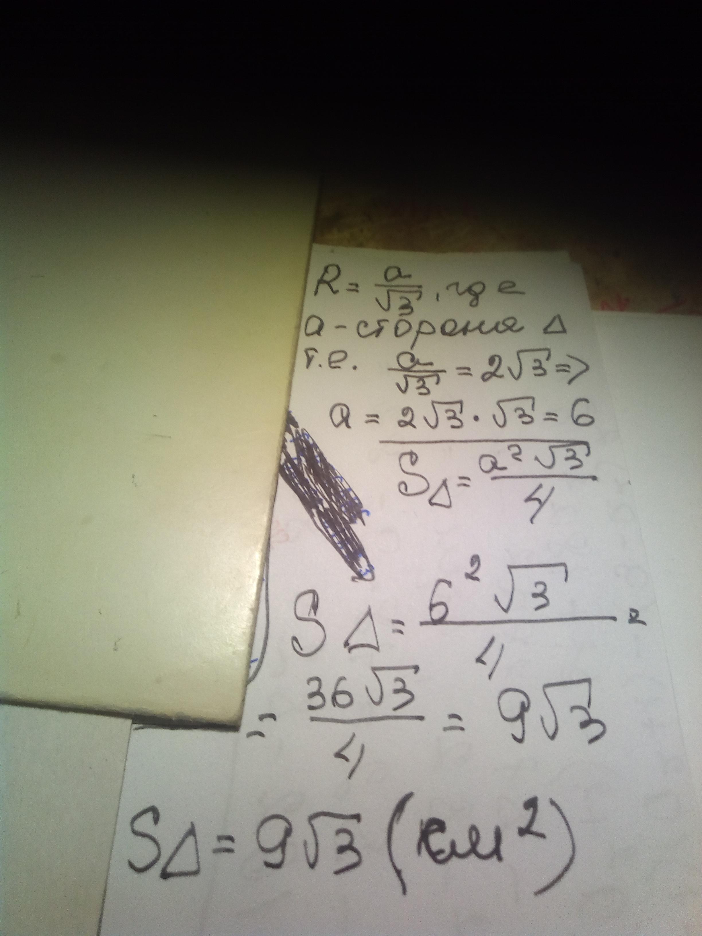 Радиус окружности ,описанной около равностороннего треугольника, равен 2 корней из 3 см. Найдите его площадь.