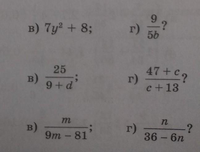 Ответ: Первая строка в) 7y² + 8 = для "у" все значения допустимы даже нуль, так как выражение решится(=8); г) все кроме 0.