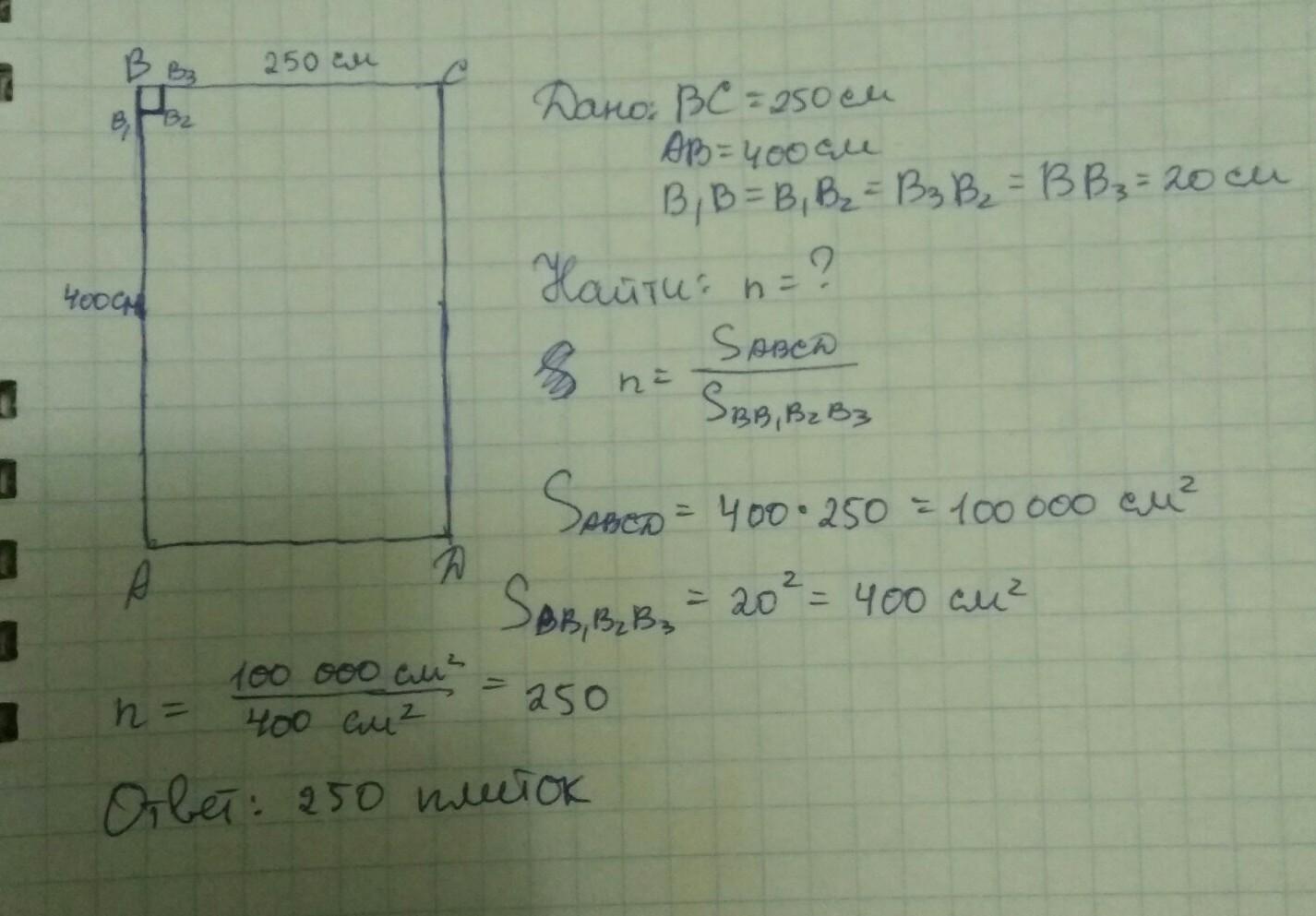 сколько потребуется кафельных плиток квадратной формы со стороной 20 см,чтобы облицевать ими часть стены,имеющей форму прямоугольника со сторонами 4 м и 2,5 м? Если есть возможность, то можно пожалуйста с рисунком.