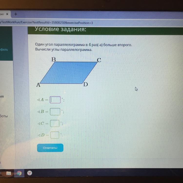 Помогите. Один из углов параллелограмма в 4 раза больше второго. Вычисли углы параллелограмма