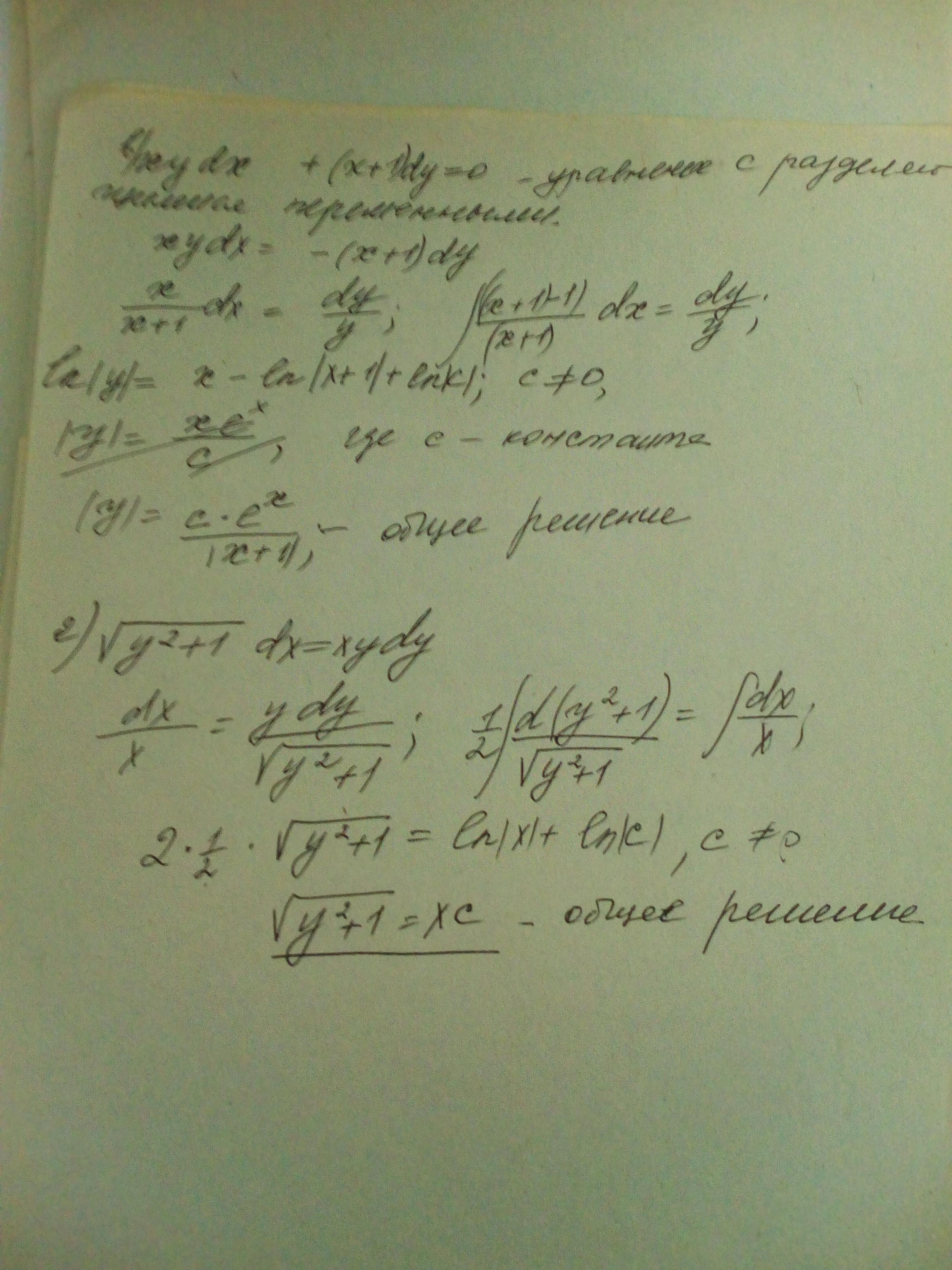 В первом |y| - модуль убрать нужно, ну а во втором последний ответ это не общее решение, а общий интеграл.