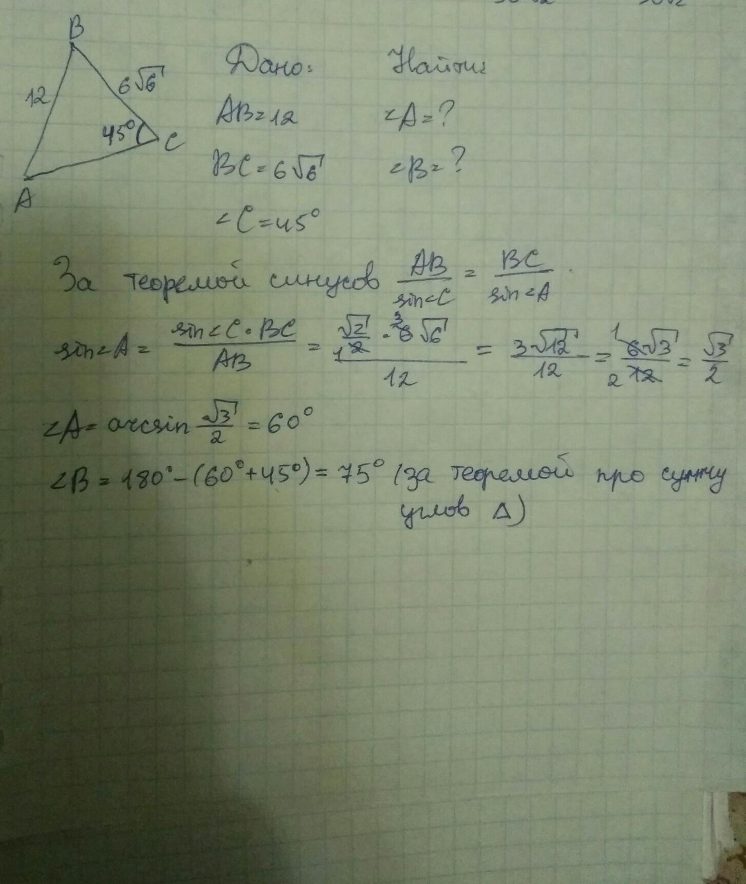 Найдите углы A и B треугольника ABC, если AB=12 см, ВС=6√6 угол, С=45 градусам. Сколько решений имеет задача?