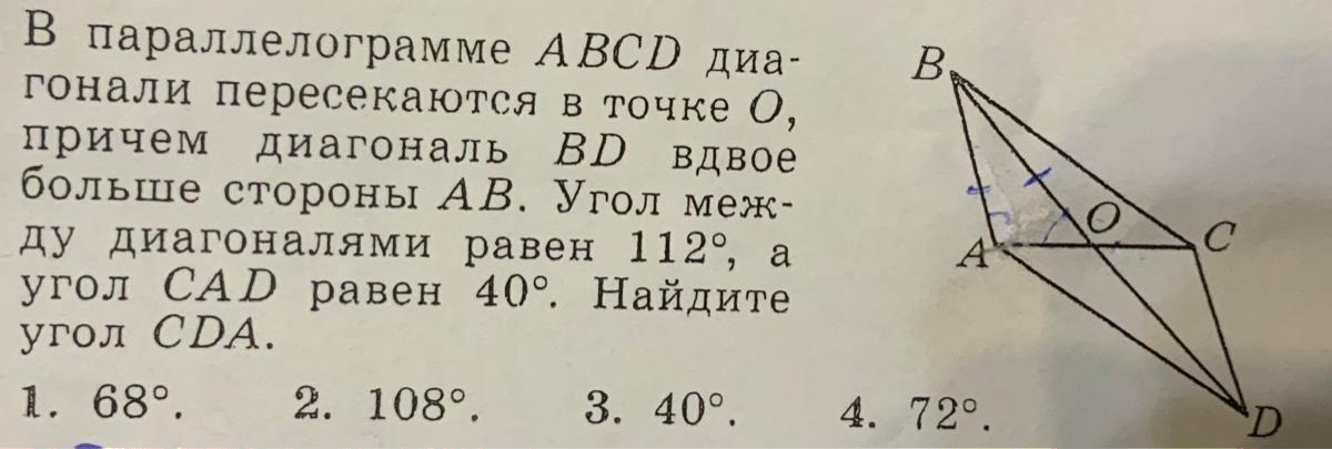 В параллелограмма ABCD диагонали пересекаются в точке O ,причём диагональ BD вдвое больше стороны AB.Угол между диагоналями равен 112 градусов,а угол CAD равен 40 градусов.Найдите угол CDA