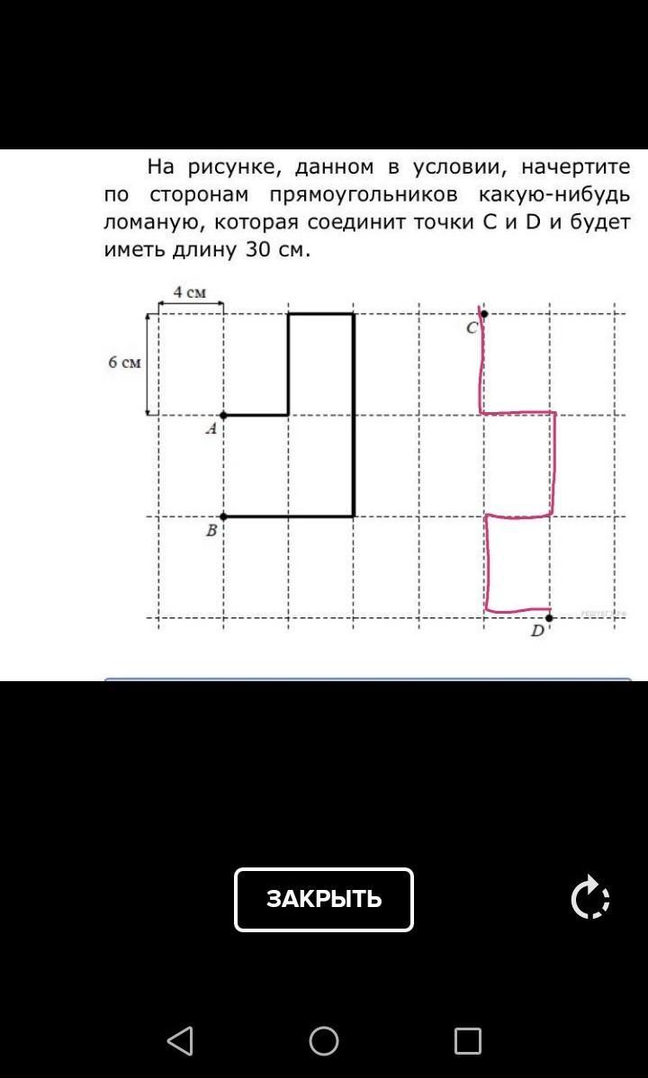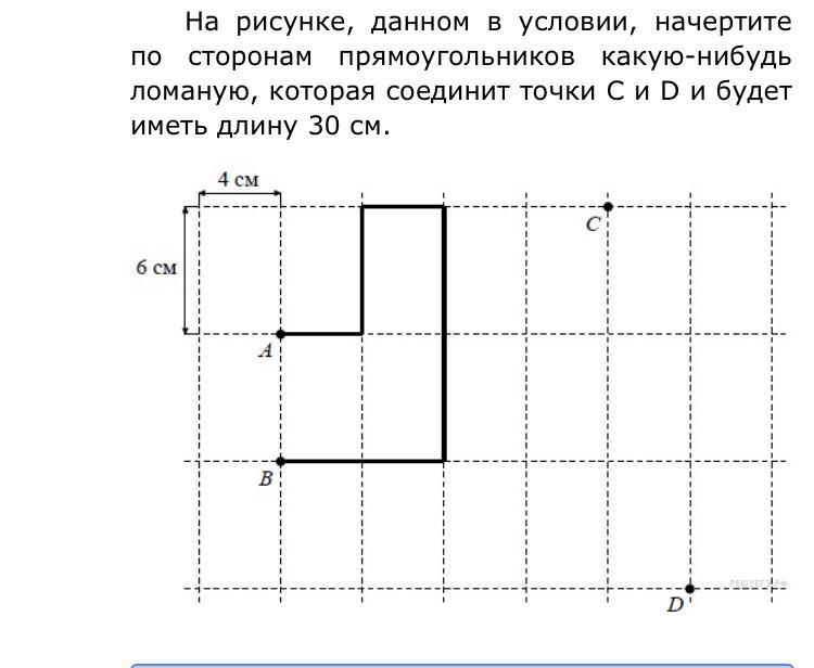 помогите пожалуйста На рисунке, данном в условии, начертите по сторонам прямоугольников какую-нибудь ломаную, которая соединит точки C и D и будет иметь длину 30 см.