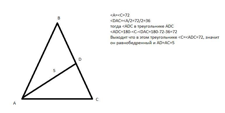 Кут при осниві рівнобедриного трикутника дорівнює 72градуси, а бісектриса кута при основі цього ж трикутника- 5см. Згайдіть основу трикутника.