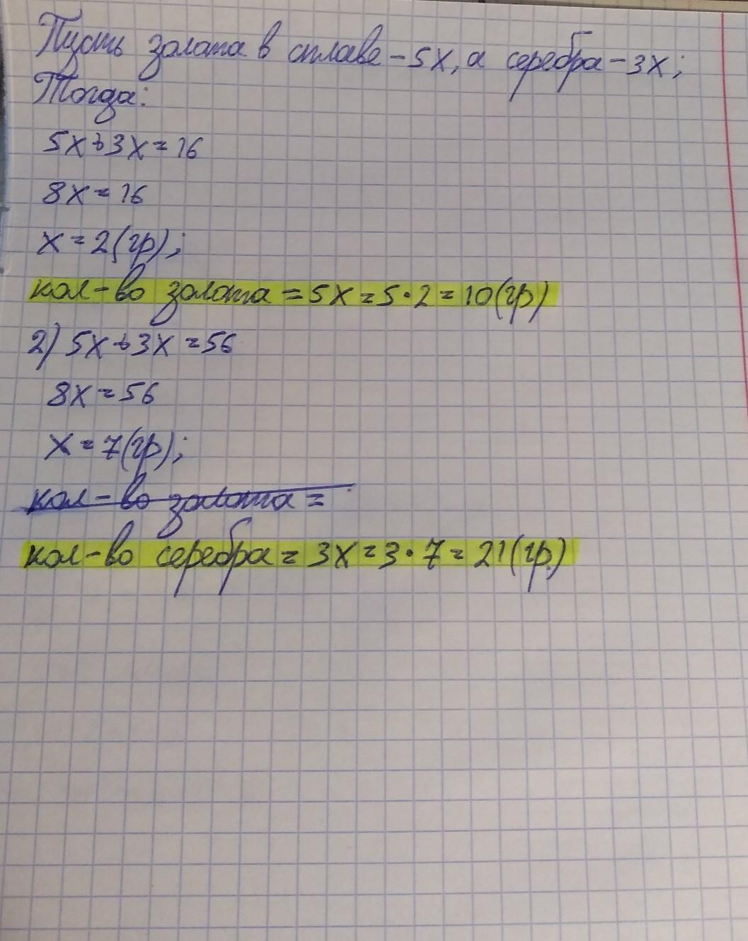 отношение массы золота и серебра в сплаве равно 5:3 1)сколько граммов золота содержится в сплаве массой 16 г? 2)Сколько граммов серебра содержится в сплаве с массой 56 г?