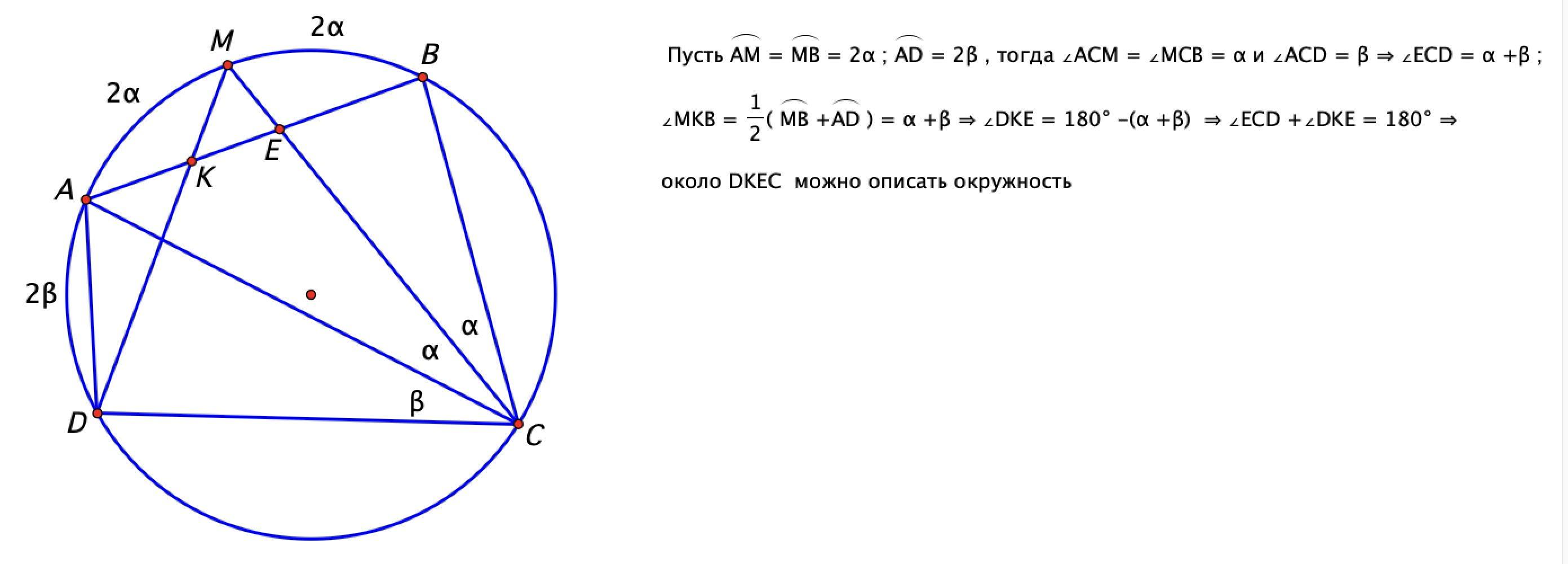 На окружности даны 4 точки A,B,C и D в указанном порядке. Точка M-середина дуги AB, K-точка пересечения хорд АВ и MD, E-точка пересечения хорд АВ и МС. Докажите, что около четырёхугольника CDKE можно описать окружность.