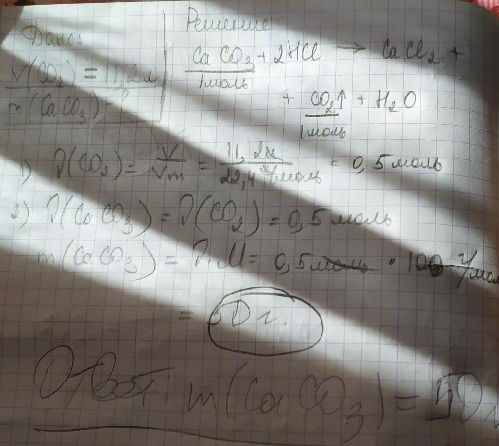 При растворении карбоната кальция в избытке соляной кислоты выделилось 11,2 л газа. Чему равна масса карбоната кальция?