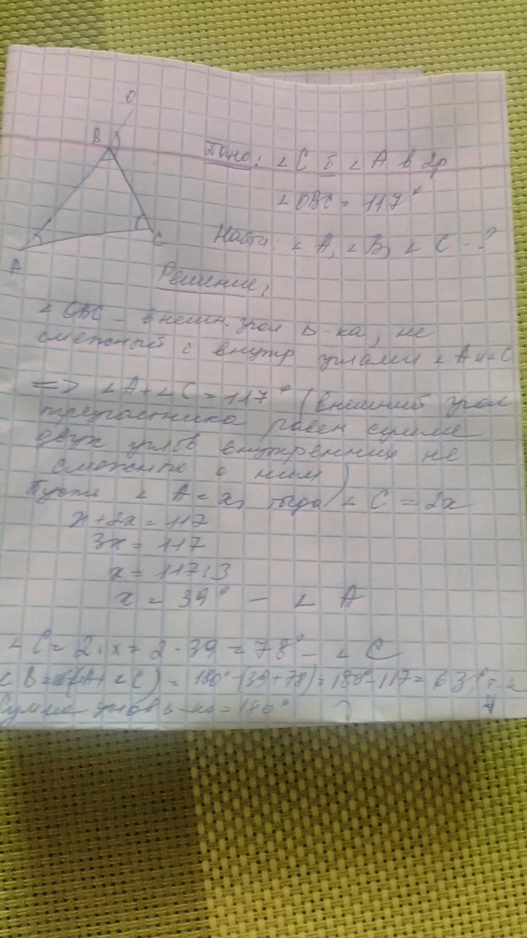 один из внутренних углов треугольника в 2 раза больше другой, а внешний угол при вершине третьего угла равна 117 градусов. найдите углы треугольника