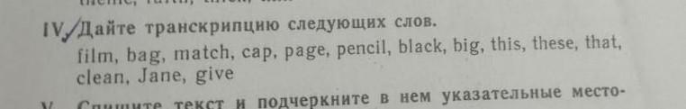 Ответ: film - [fɪlm] bag - [bæɡ] match - [mætʃ] cap - [kæp] page - [peɪdʒ] pecil - [ˈpensl] black - [blæk] big - [bɪɡ] this - [ðɪs] these - [ðiːz] fhat - [ fhat] clean - [kliːn] Jane - [ʤeɪn] give - [ɡɪv]