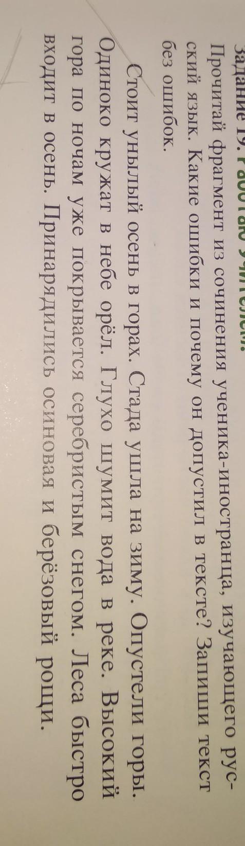 Стоит унылая осень в горах. Стада ушли на зиму. Опустели горы. Одиноко кружит в небе орёл. Глухо шумит вода в реке. Высокая гора по ночам уже покрывается серебристым снегом. Леса быстро входят в осень. Принарядились осиновая и берёзовая рощи.