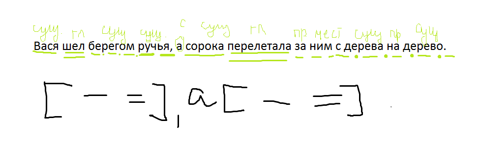Вася шел берегом ручья, а сорока перелетала за ним с дерева на дерево. (повеств., невоскл., сложное, союзное, ССП; 1 пр. - простое, двусост., распр., не осложнено; 2 пр. - простое, двусост., распр., не осложнено; *схема*).