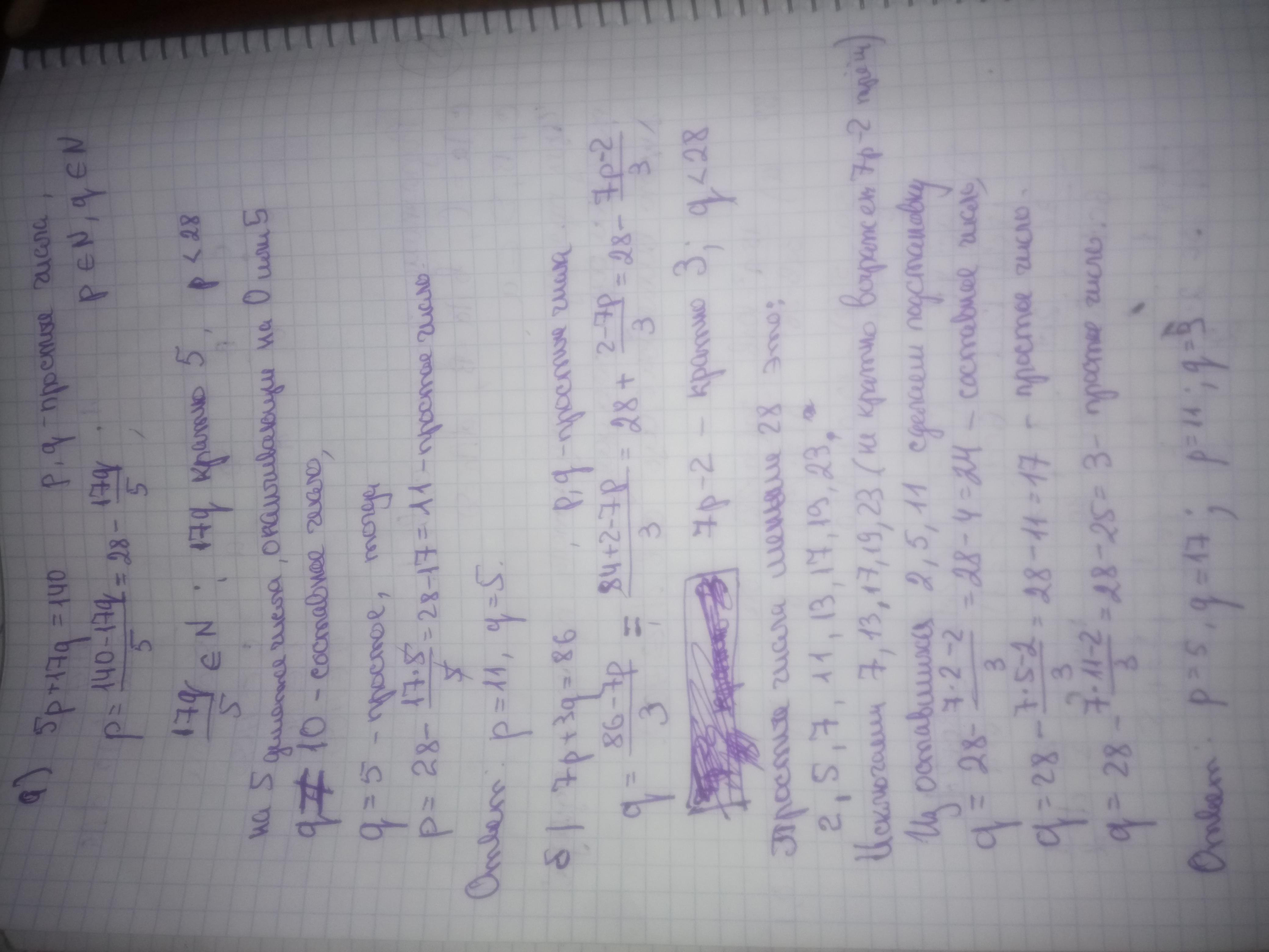 Найдите все простые числа p и q такие, что: а) 5p + 17q = 140; б) 7p + 3q = 86. Можно без метода подстановки, и не те варианты, которые на всех сайтах в инете. Как решать , когда выражаешь одну переменную , что дальше, кто-нибудь объясните прошуууу