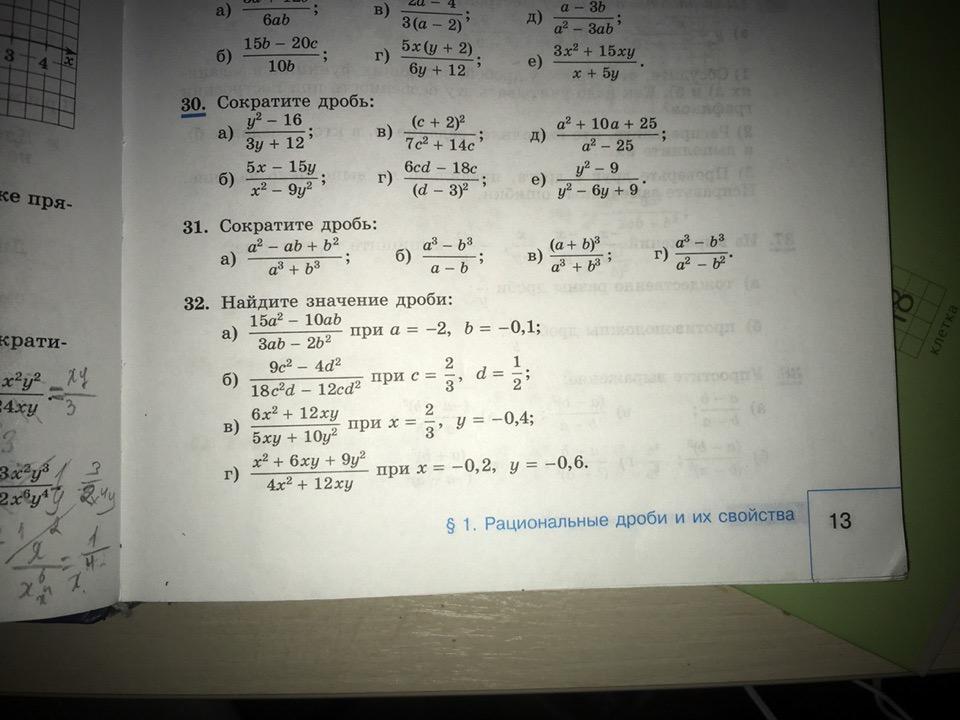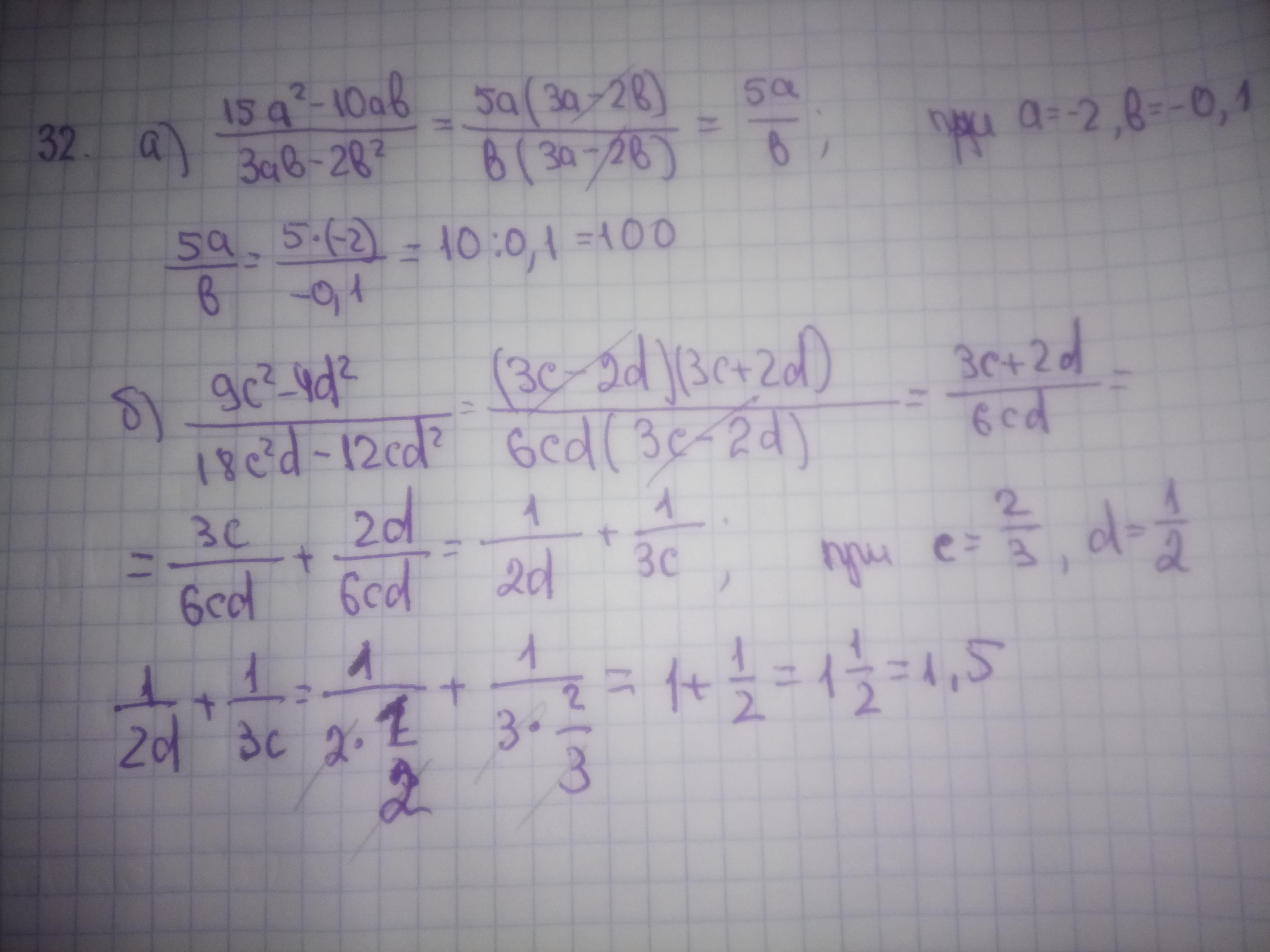 номер 32 а) Сначала вынести за скобки общий множитель, потом сократить, потом заменить буквы их значениями и сосчитать