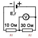 К источнику тока с ЭДС=9 В и внутренним сопротивлением 5 Ом подключены проводники сопротивлением 10 Ом и 30 Ом. Найти показания вольтметра (см. рис.2)
