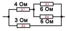 Rобщ = ( R1*R234 ) / ( R1 +R234 ) = ( 3*7 ) / ( 3 +7) = 21/10 = 2,1 Ом