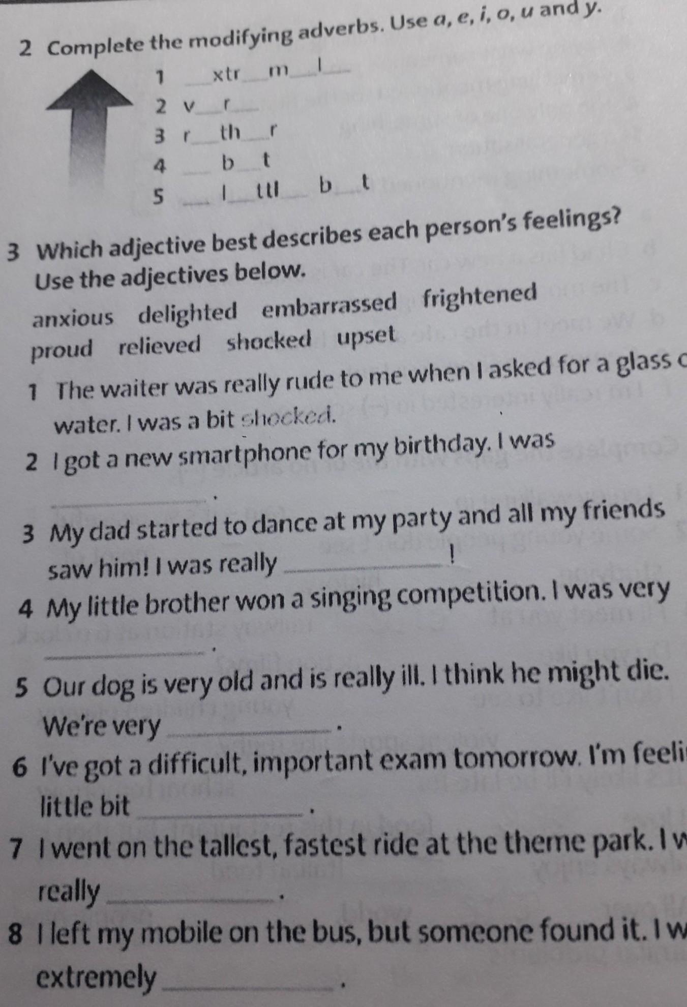 3) 2 delighted 3 embarrassed 4proud 5 upset 6 anxious 7 frightened 8 relieved