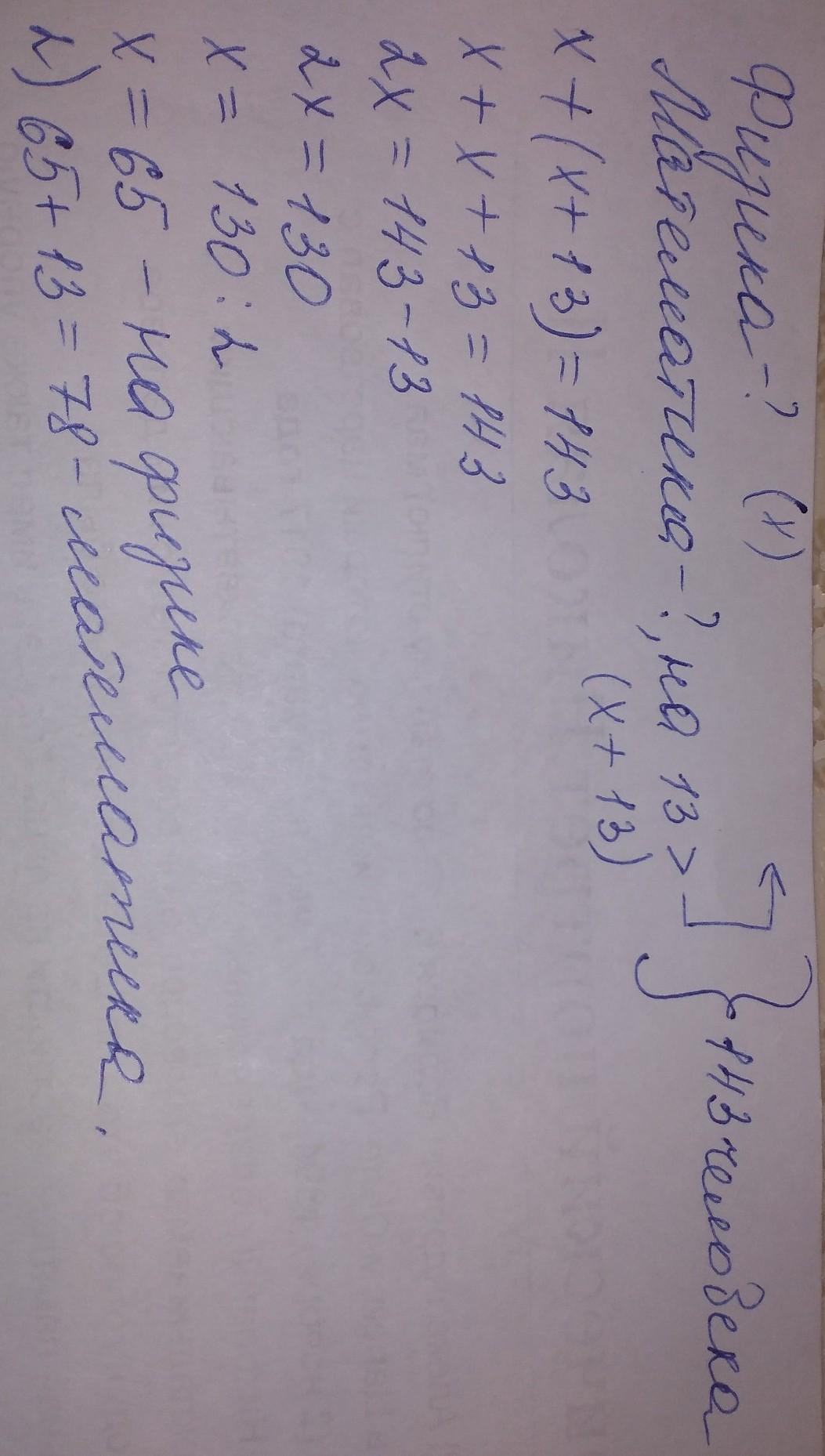 В школе проходили олимпиады по математике участников окозалось на 13 человек больше, чем на олимпиаде по физике. Сколько было участников на каждой олимпиады, если всего в мероприятии приняли 143 школьника?