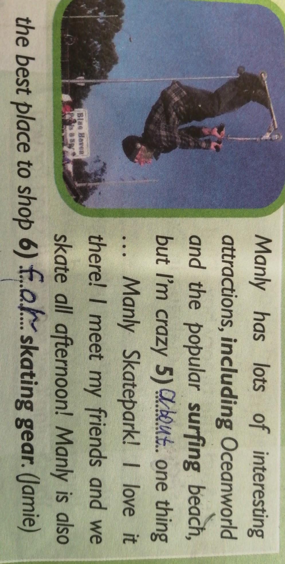 В Мэнли есть много интересных достопримечательностей, в том числе Oceanworld и популярный пляж для серфинга, но я сумасшедший. 5) У Мэнли есть один скейтпарк! Я люблю там! Я встречаюсь с друзьями и мы катаемся весь день! Мэнли - также лучшее место, чтобы делать покупки 6). (Джейми)