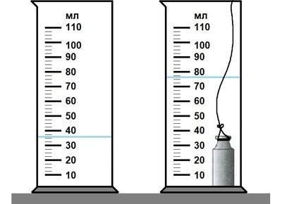 Так как сначала воды было 38,8 мл(примерно),а потом стало 78 мл(примерно),от 78 отнимаем 38,получаем обьем тела - 40 мл.