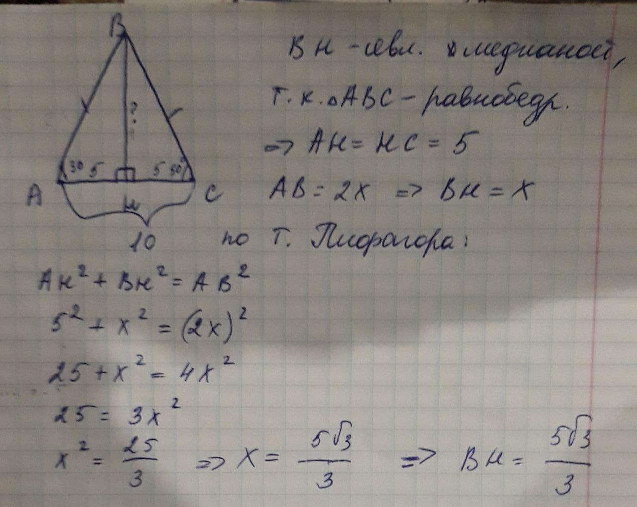 Найдите высоту, проведенную к основанию равнобедренного треугольника, если основание равно 10, а угол при основании равен 30 градусам Срочно Решите Плиз