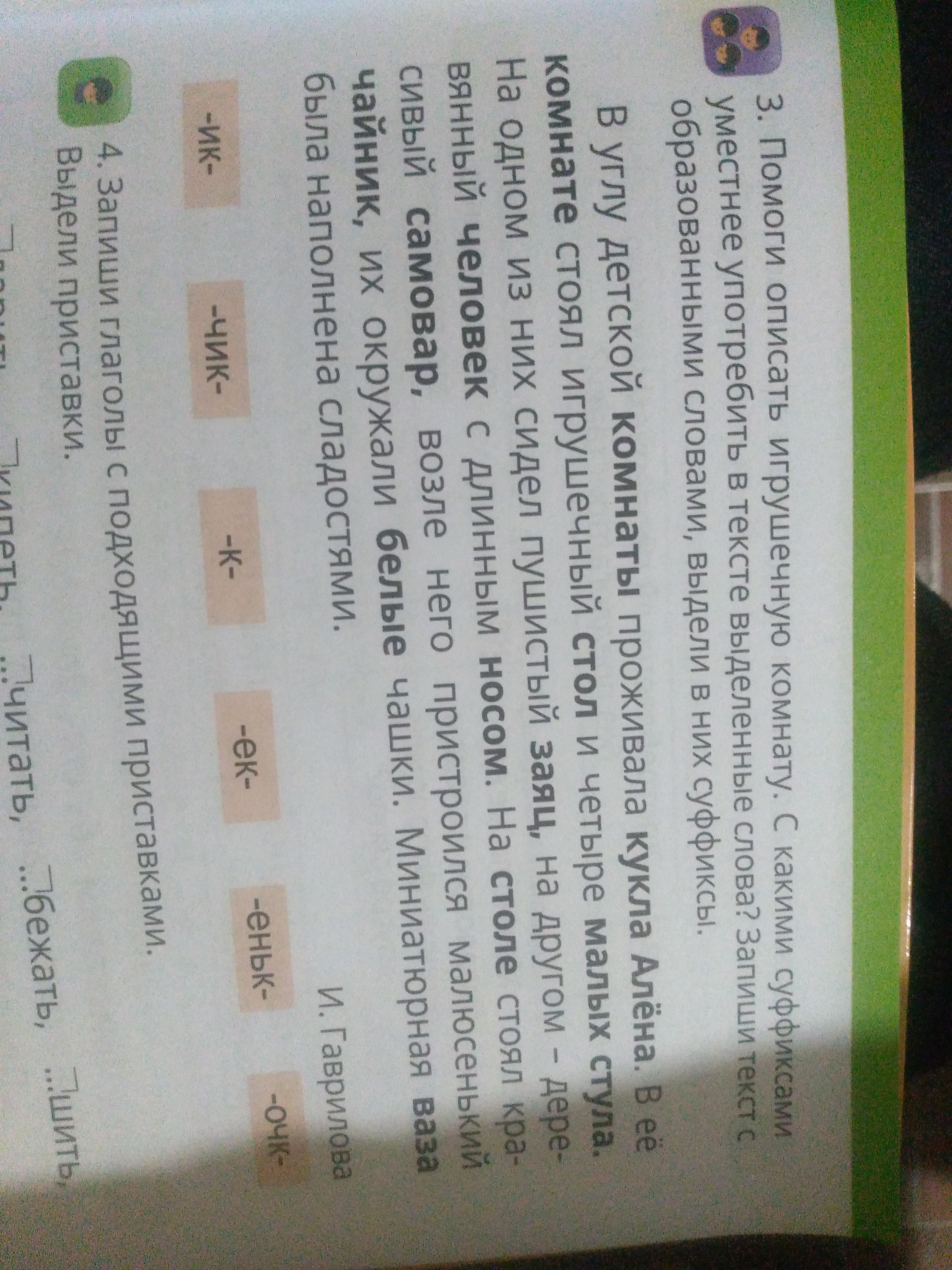 Ответ: В углу детской комнатКи проживала куколКа АлёнКа. В её комнатКе стоял игрушечный столИК и четыре малЕНЬКих стульЧИКа. На одном из них сидел пушистый зайЧИК, на другом - деревянный человечЕК с длинным носИКом. На столИКе стоял красивый самоварЧИК, возле него пристроился малюсЕНЬКий чайничЕК, их окружали белЕНЬКие чашки. Миниатюрная вазОЧКа была наполнена сладостями.