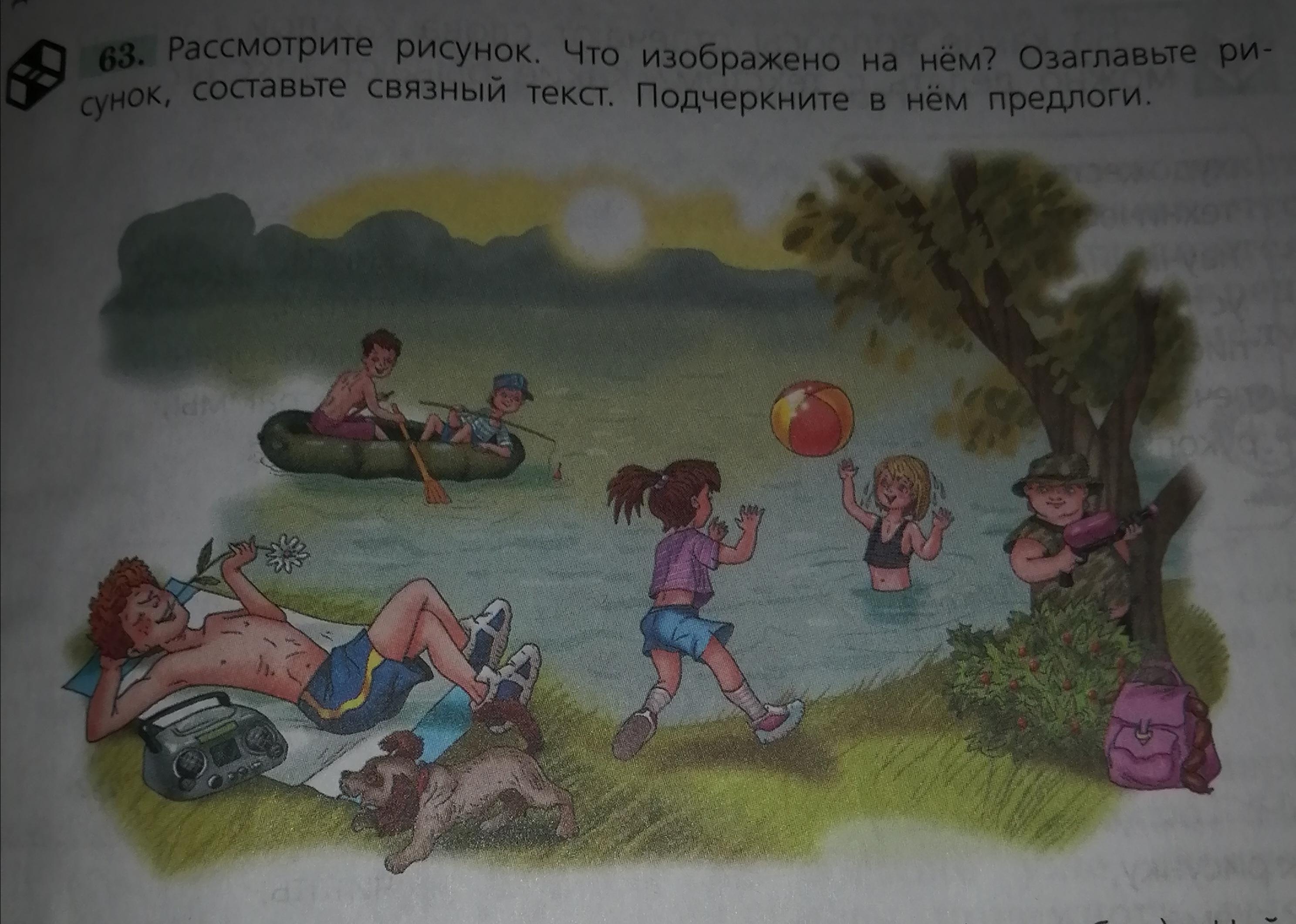 Предложение: В летний день ребята играли ; Девочки играли в мяч ; Мальчик справа игрался с водным бластером ( Мальчику можно придумать имя) ; Ребята катались на надувные лодке ; Самый старший мальчик загорал.