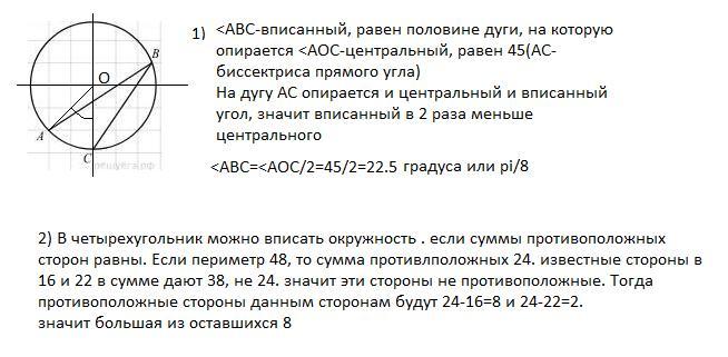 Задание 2: Периметр четырёхугольника, описанного около окружности, равен 48, две его стороны равны 16 и 22. найдите большую из оставшихся сторон.