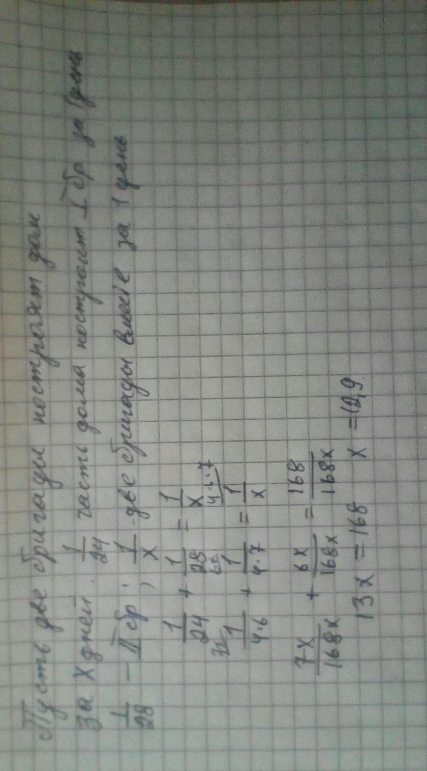 Первая бригада построит дом за 24 дня, а вторая бригада за 28 дней. За сколько дней две бригады построят дом вместе?