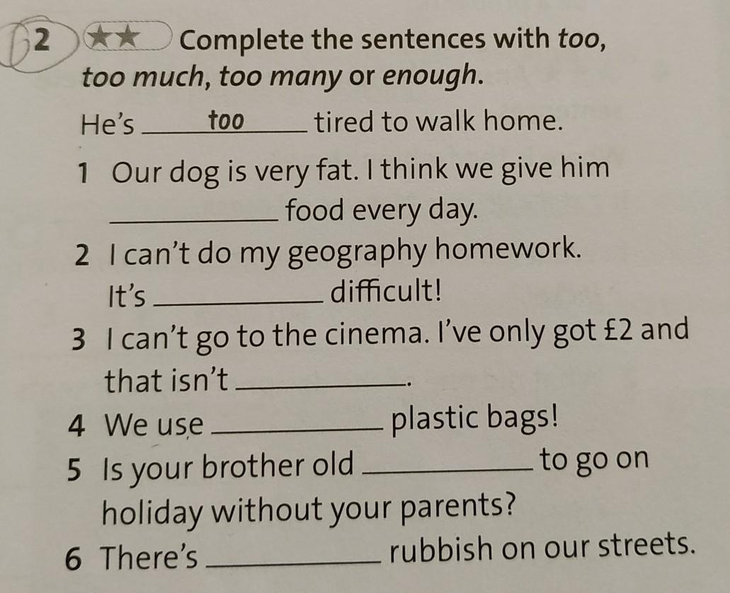 1.Too much 2.too 3.Enough 4.too many 5.enough 6.too much