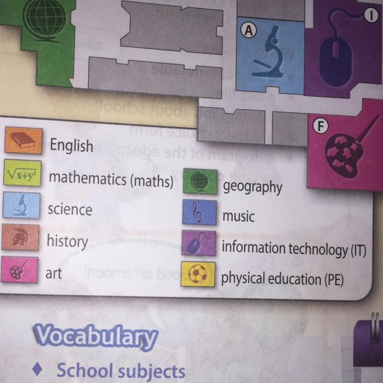 Английский, математика, наука (Ну.. Химия же chemistry...), история, искусство, география, музыка, информатика, физкультура .