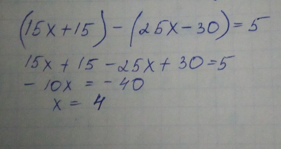 Найдите значение x, при которых значение выражения 25x - 30 на 5 меньше от значения выражения 15x +15.