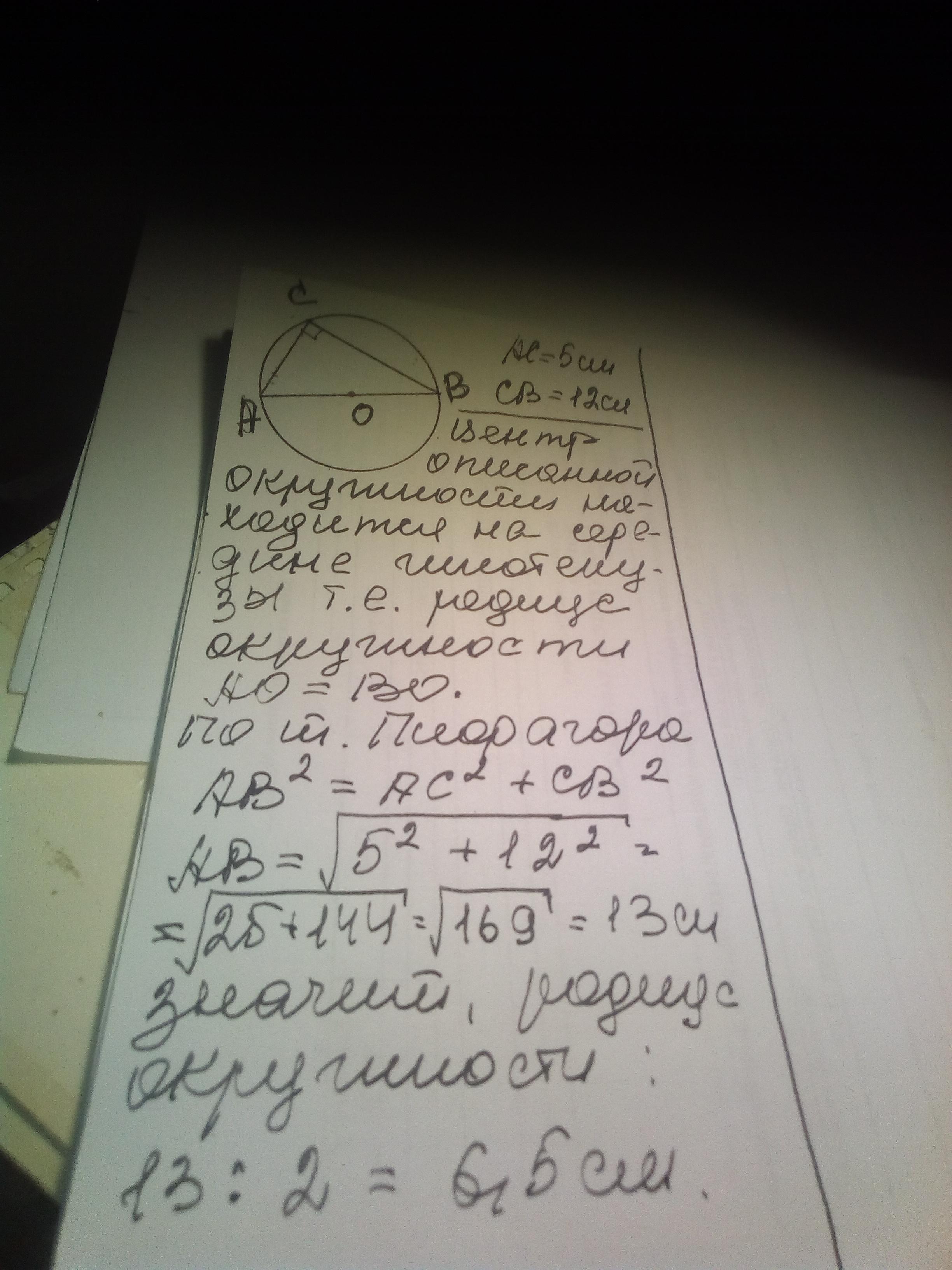 Прямоугольный треугольник с катетами 5см и 12см вписан в окружность. Чему равен радиус этой окружности?