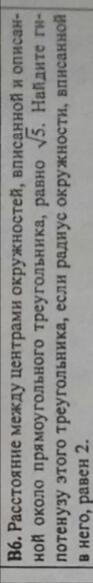 Пошаговое объяснение: Центр окружности М - описанной около прямоугольного треугольника это середина гипотенузы. Центр вписанной окружности О. Точка касания с гипотенузой К. ОКМ -прямоугольный треугольник. ОК=2, КМ=корень из 5. КМ^2=5-4=1 KM=1