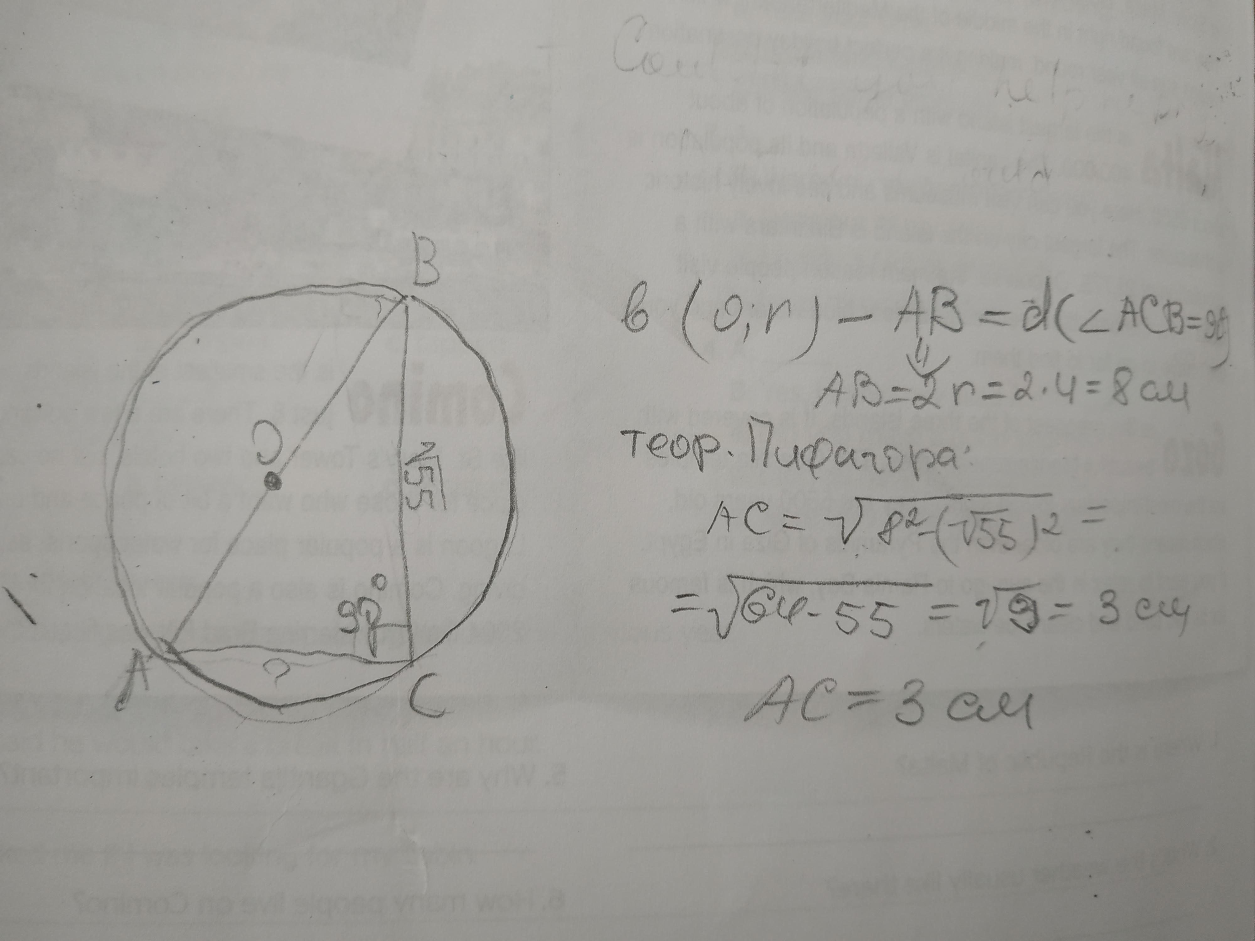 В треугольник АВС ВС= корень из 55, угол С= 90, радиус окружности описанной около треугольника = 4. Нати АС.