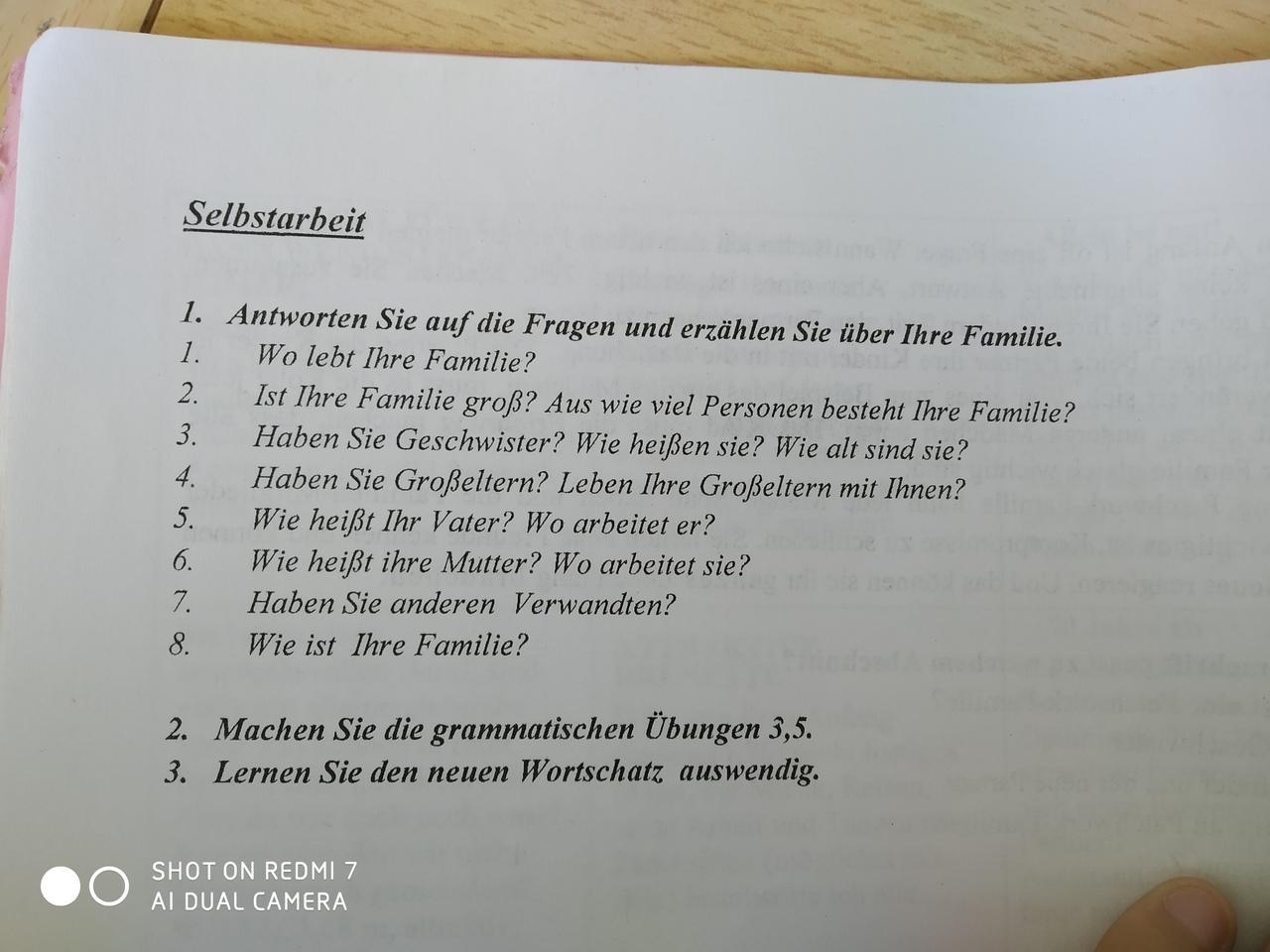 ответьте на вопросы и расскажите о своей семье. 1. Где проживает ваша семья? 2. Ваша семья большая? Из скольких членов она состоит? 3. У вас есть братья/сестры? Как их зовут? Сколько им лет? 4. У вас есть бабушка/дедушка? Они проживают с вами? 5. Как зовут вашего отца? Где он работает? 6. Как зовут маму? Где она работает? 7. У вас есть другие родственники? 8. Какая ваша семья?