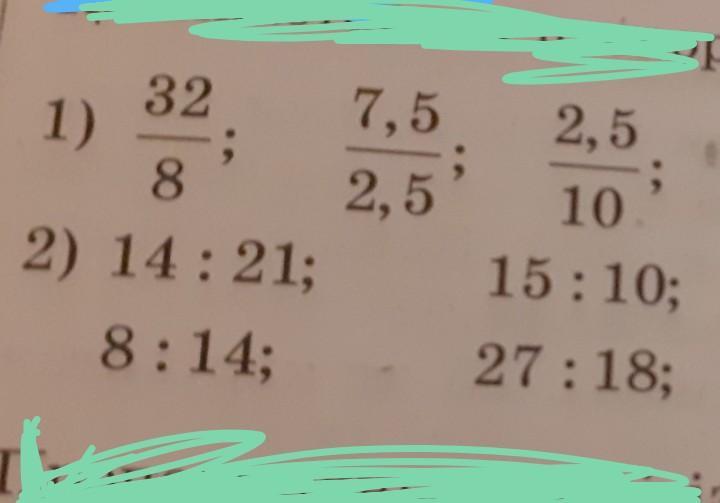 2) 14:21=14/21=2/3 (сокращение дроби на 7); 8:14=8/14=4/7; 15:10=1.5; 27:18=27/18=3/2=1`1/2.