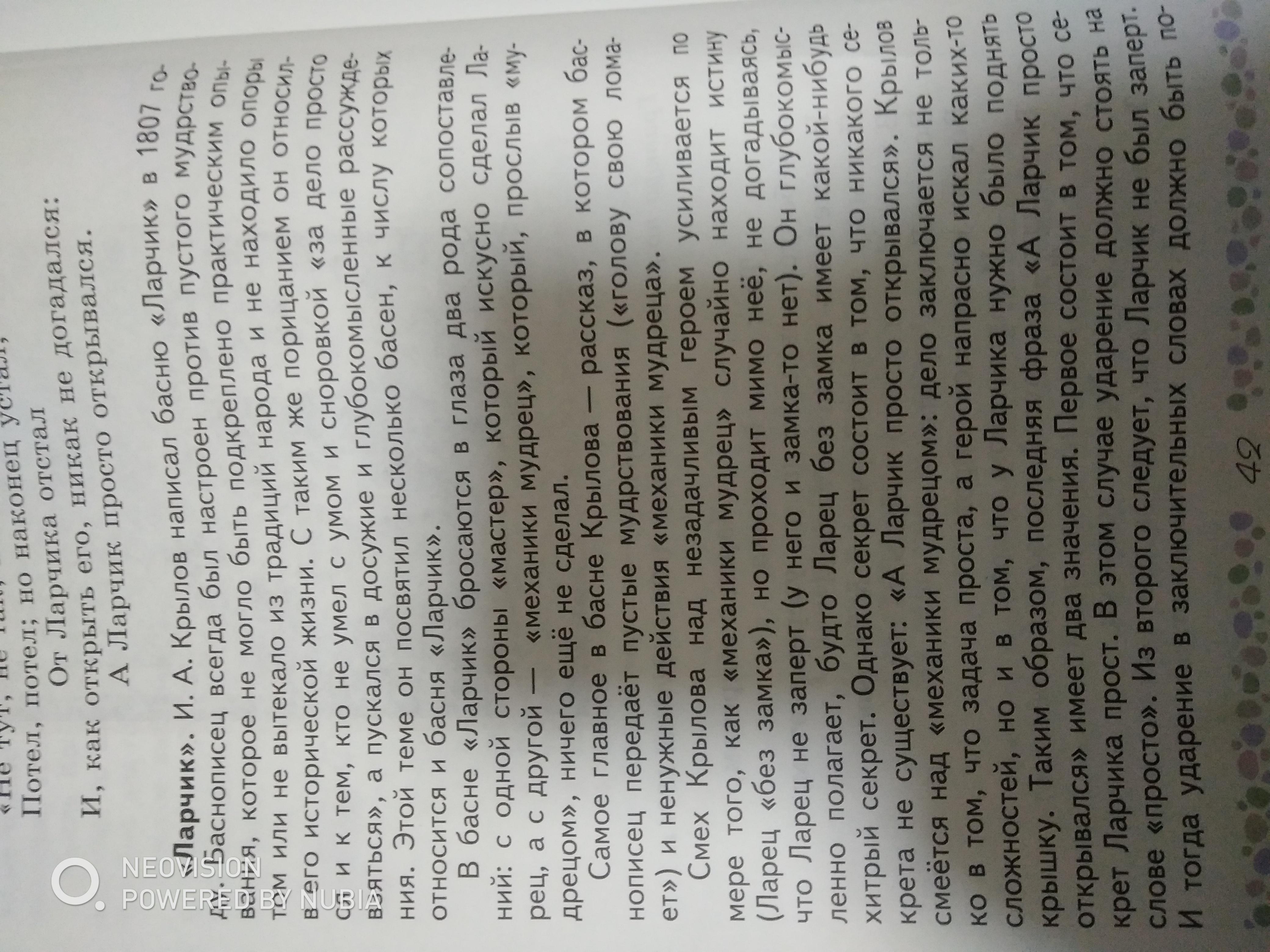 К кому-то принесли от мастера красивый Ларчик, которым все любовались. Пришёл посмотреть на него и «мудрец механики». Привыкнув к сложной работе, он удивился, что на Ларчике нет замка, и предположил: тот имеет секрет и открывается по-особому. Механик принялся вертеть Ларчик, нажимая то на гвоздик, то на скобку, но разгадки «секретного запора» не обнаруживалось. Немало попотев, механик без успеха бросил свои попытки. Он видел скрытую мудрость там, где её совсем и не было. Ведь «Ларчик просто открывался "