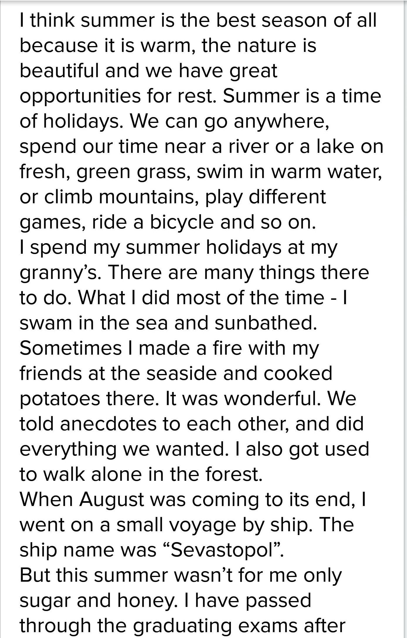 Я думаю что лето лучшее время для всех потому что тепло природа прекрасна и у нас есть прекрасные возможности для отдыха и это время праздников мы сможем пойти куда угодно провести время у реки или озера на свежий зелёной траве поплавать в тёплой воде или забраться на горы поиграть в разные игры покататься на велосипеде так далее проведи мои летние каникулы у моей бабушки есть много вещей которые нужно сделать что я делал большую часть времени я плавал в море и загорал иногда я поджигал с моими друзьями на берегу моря и готовят там картошку это было замечательным мы рассказывали что хотели Я тоже привык гулять концу я нравился мне большое плавание на корабле название корабля было севастопольское на это лето было для меня нет только с сахаром и медом