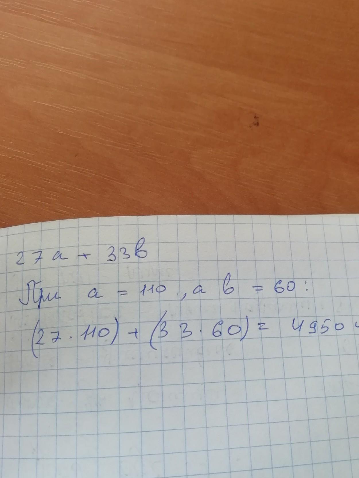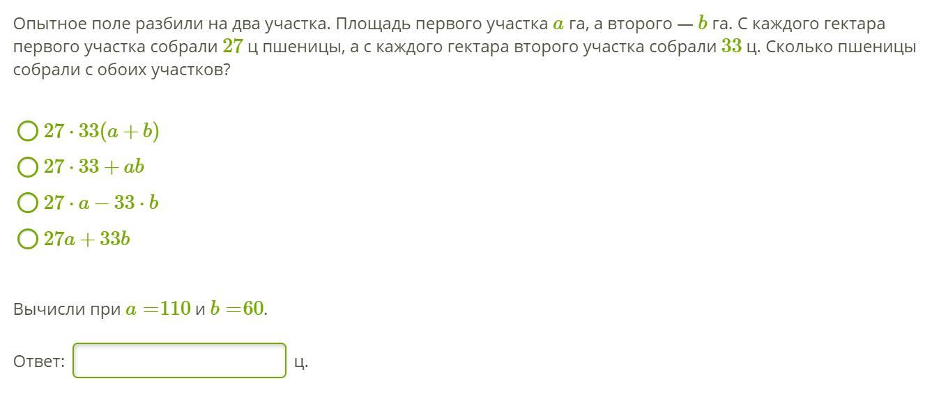 Опытное поле разбили на два участка. Площадь первого участка a га, а второго — b га. С каждого гектара первого участка собрали 27 ц пшеницы, а с каждого гектара второго участка собрали 33 ц. Сколько пшеницы собрали с обоих участков?