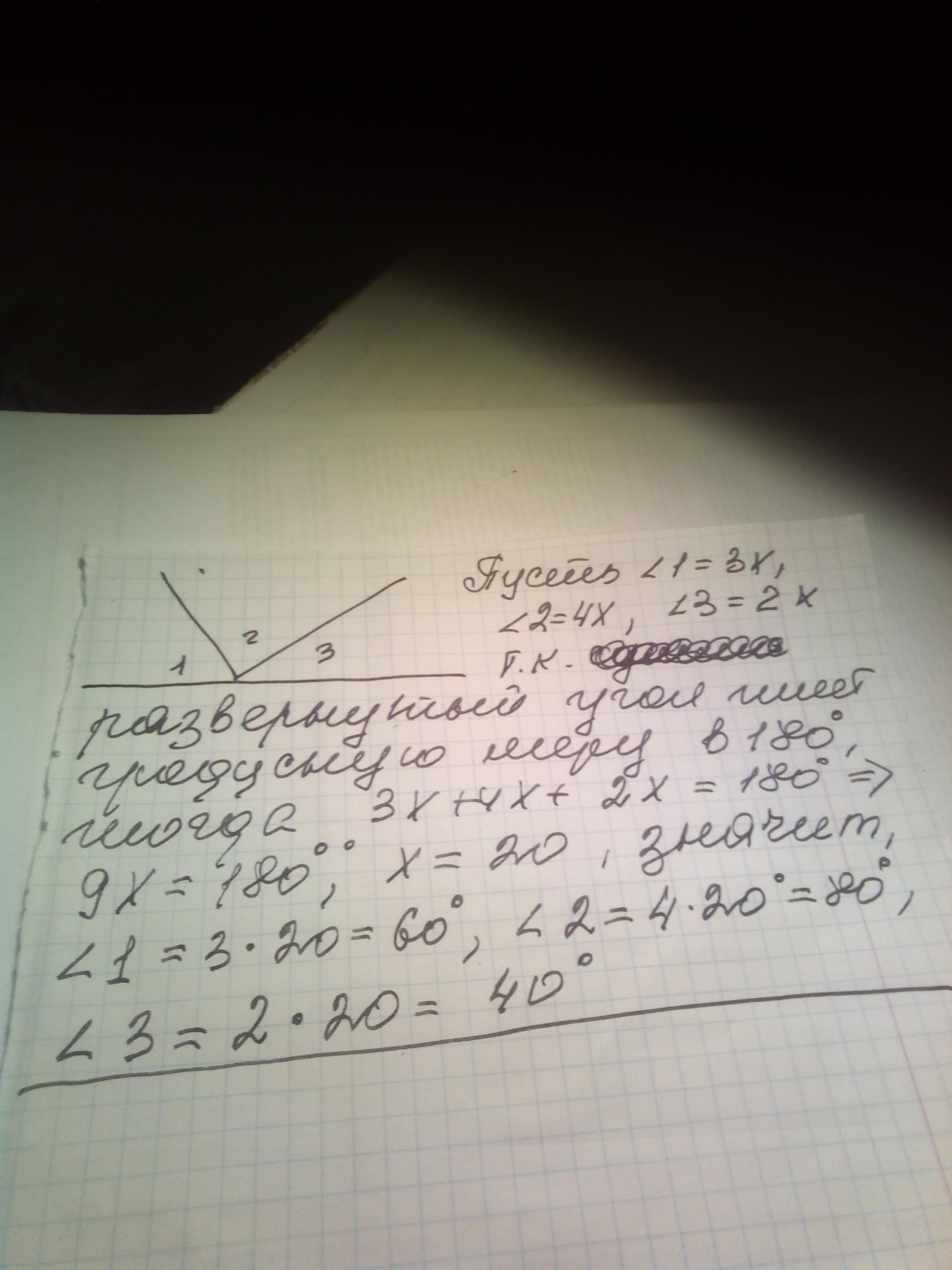 Развёрнутый угол поделён на три части, градусные меры которых относятся как 3:4:2. Найти величины этих частей