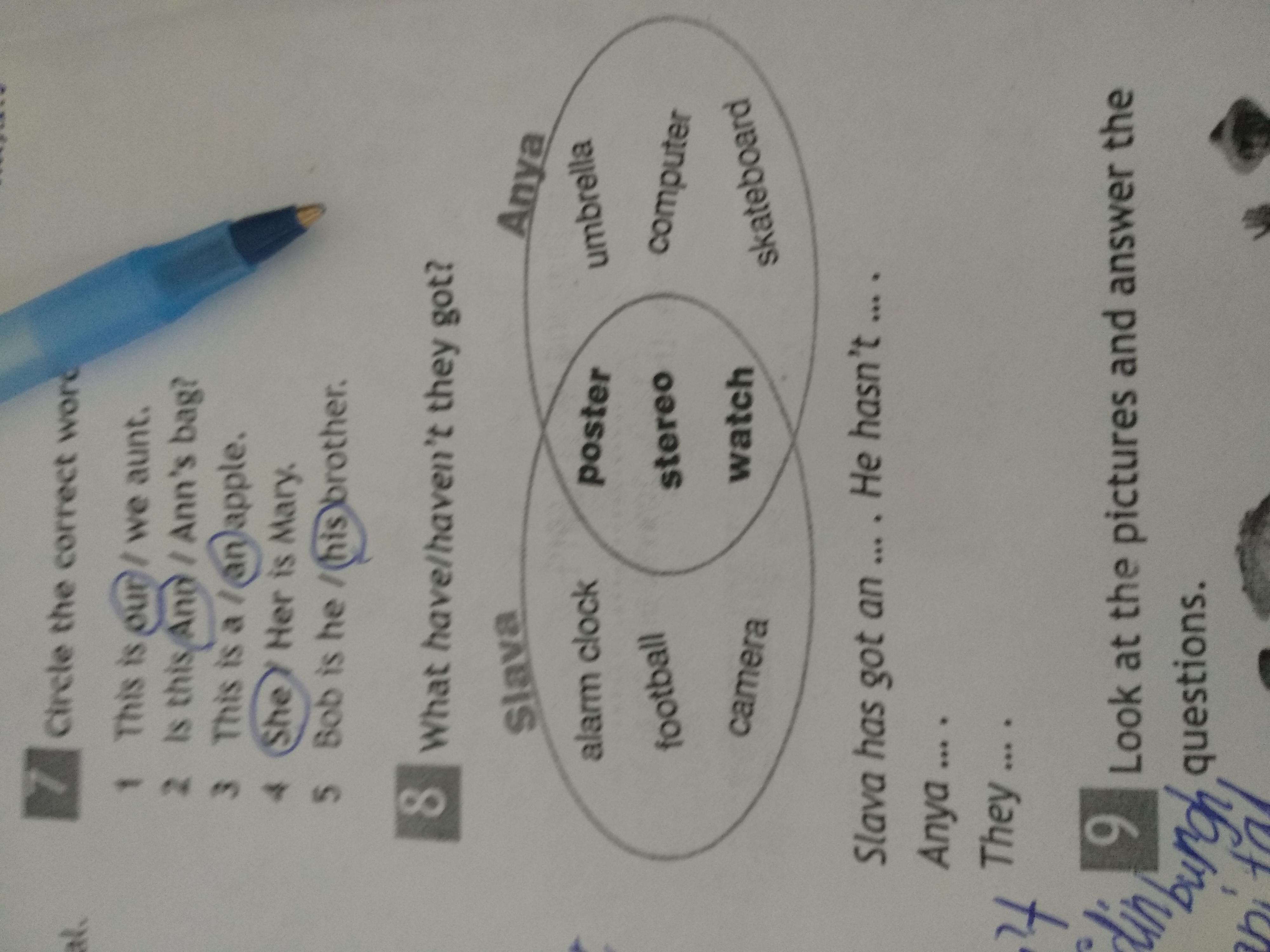 Anya has got an umbrella computer and skateboard. She hasn't got an alarm clock footbal and camera. They have got a poster, stereo and watch