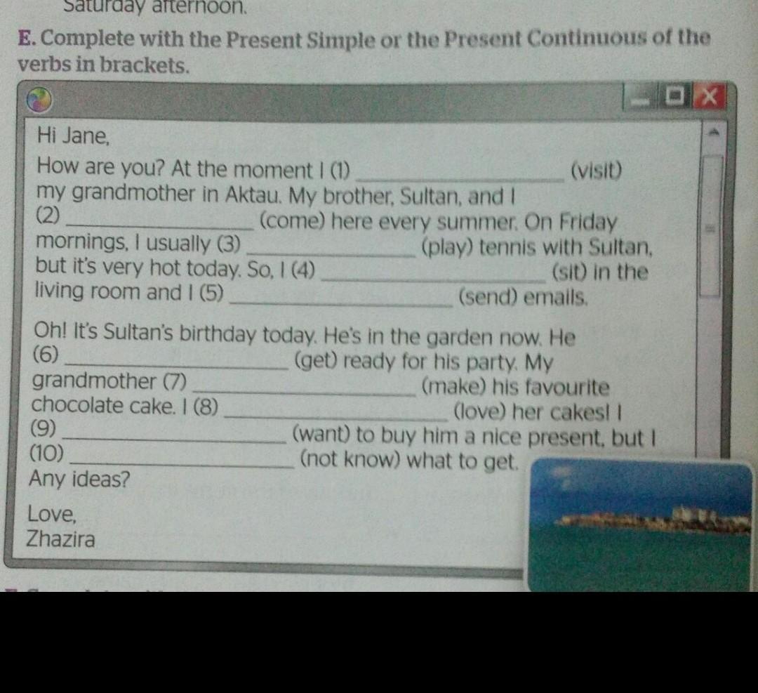 how are you? at the moment i visit my grandmother in aktau. my brother, sultan and i come here every summer. one friday mornings. i usually play tennis with sultan, but it's very hot today. so i am sitting in the living room and i send emails.