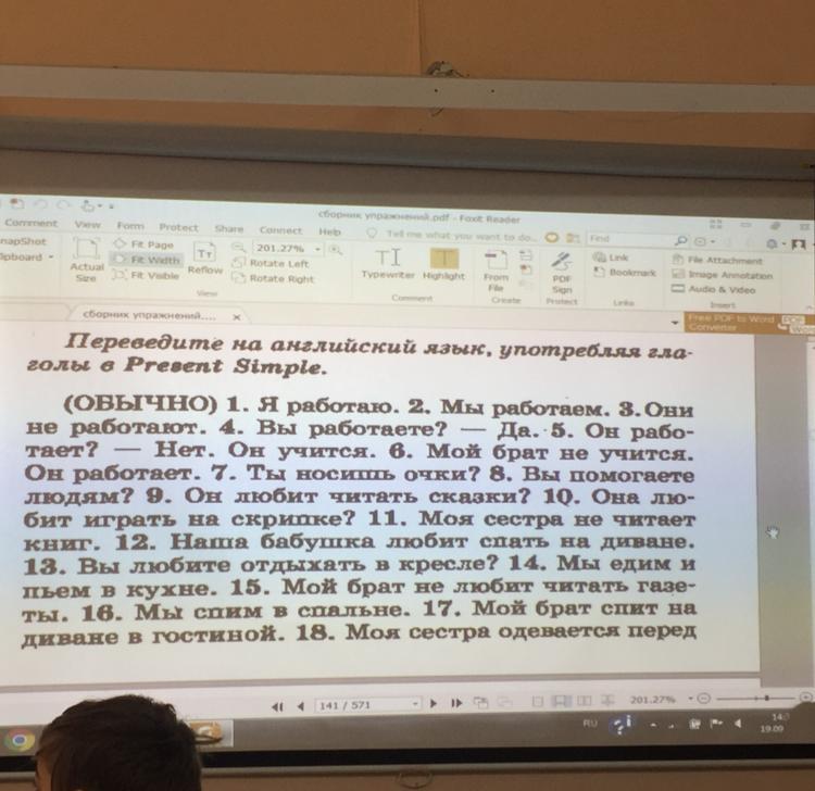 I work. We work. They don't work. Are you work? - Yes, you are. Is he work? -No, he learns. My brother doesn't learn. He works. Do you wear glasses? Do you help people? Does he like reading fairytales? Does she like playing the violin? My sister doesn't read books. Our granny likes sleeping on the coach. Do you like to relax in a chair? We eat and drink in the kitchen. My brother doesn't like to read magazines. We sleep in the bedroom. My brother sleeps in the living room on the sofa.