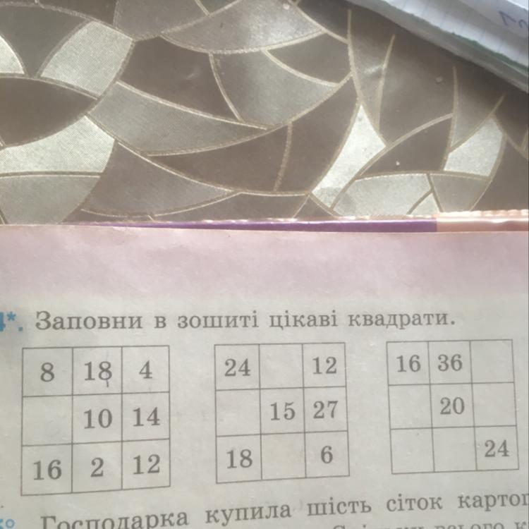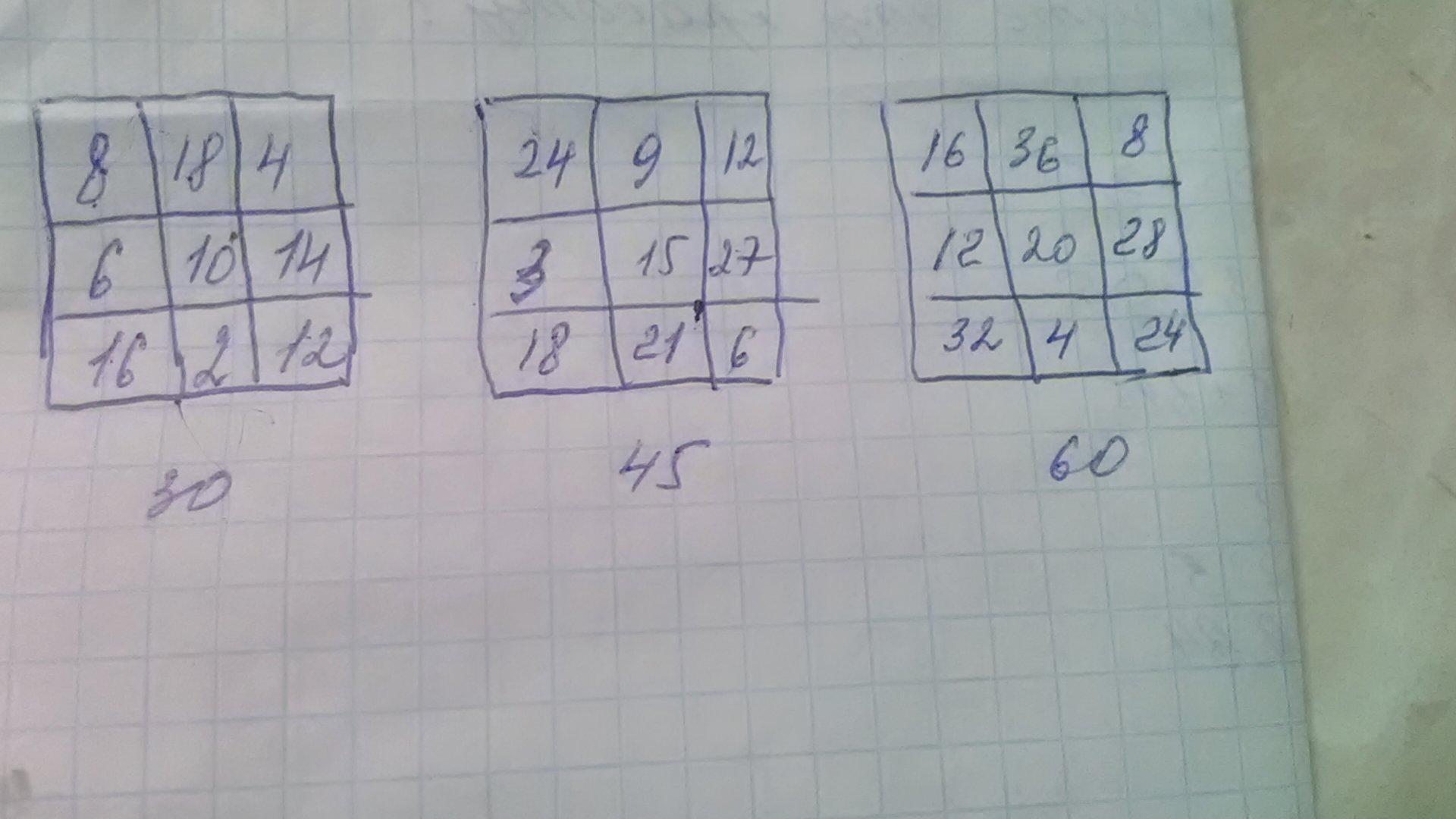 Сумма чисел по горизонтали, вертикали, диагонали в квадратах:
