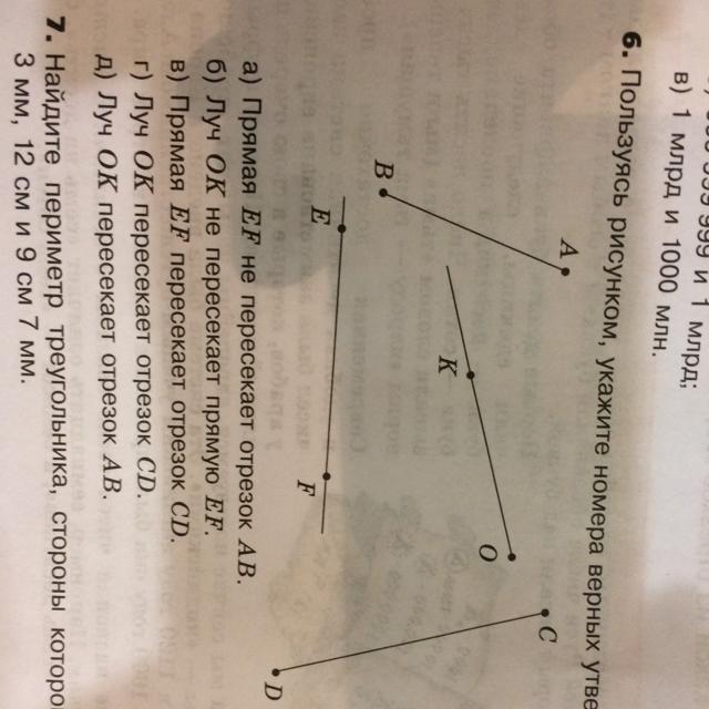 в) прямая EF пересекает отрезок CD - верное утверждение (прямую EF можно продлить (приложите линейку) и она пересечет отрезок CD);